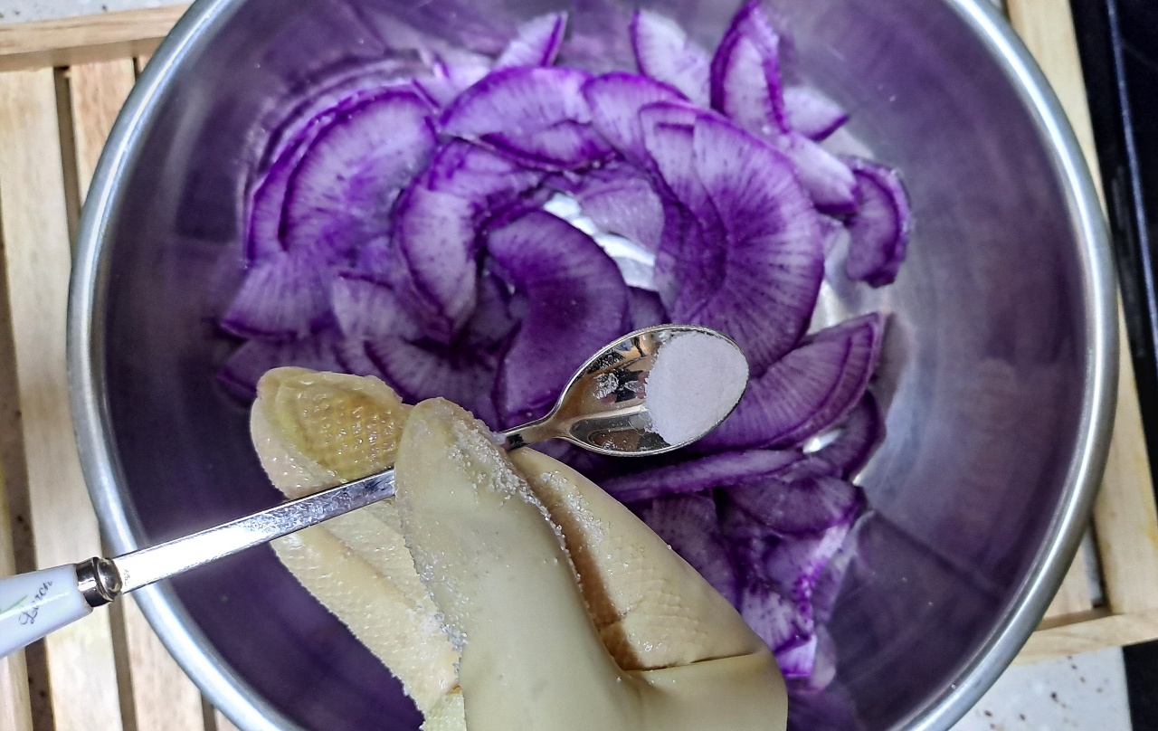 5.하현달모양으로 썰어놓은 무를 소금 한꼬집과 백설탕을 솔솔 뿌려가며 골고루 섞어줍니다.