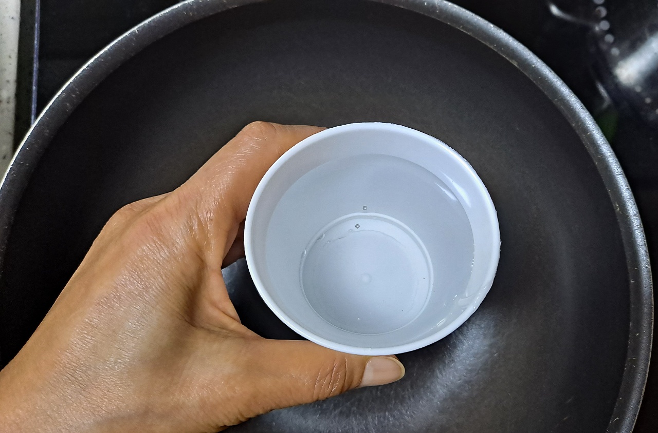 8.냄비에 물엿 종이컵 1컵을 붓고 무즙 반컵을 부어 끓여줍니다.